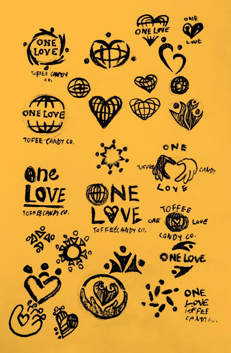The logo exploration phase focused on capturing the warmth and approachability of the One Love Toffee brand, while improving legibility and polish. I experimented with custom lettering and shape-driven marks that could balance friendliness with trust.